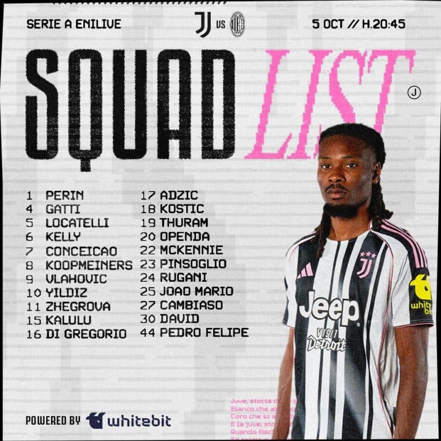 Главный тренер «Ювентуса» Игор Тудор назвал список игроков вызванных на матч против «Милана». Вне заявки остались Глейсон Бремер и Фабио Миретти. Вернулся в строй Кефрен Тюрам
