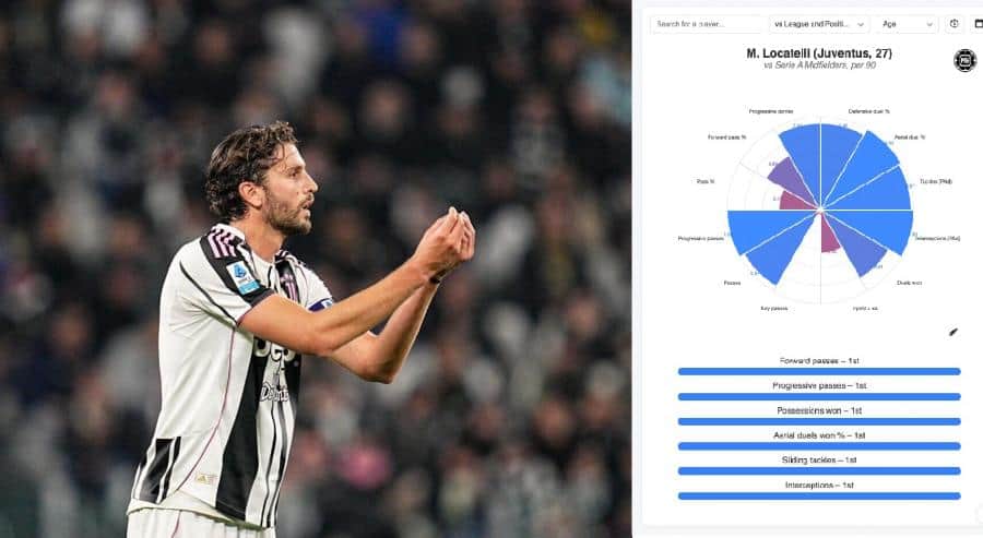 Мануэль Локателли проводит выдающийся сезон: по данным DataMB, ни один полузащитник в топ-5 европейских лиг не делает больше прогрессивных передач (13,7 за матч) и перехватов с поправкой на владение (10,96), чем игрок «Ювентуса».