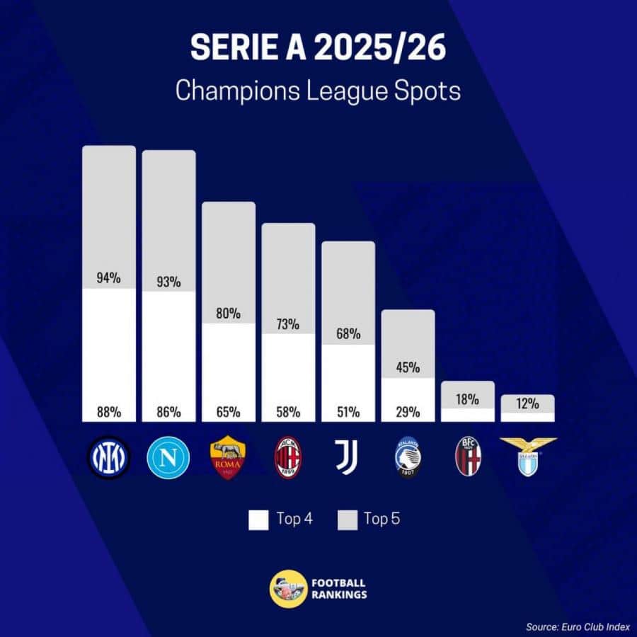 Аналитический ресурс Football Rankings опубликовал обновлённые оценки шансов клубов Серии A на попадание в топ-5 по итогам сезона. Согласно расчётам, «Ювентус» имеет 68% вероятности финишировать в пятёрке лучших — меньше, чем у «Интера» (92%), «Наполи» (93%), «Ромы» (80%) и «Милана» (73%).